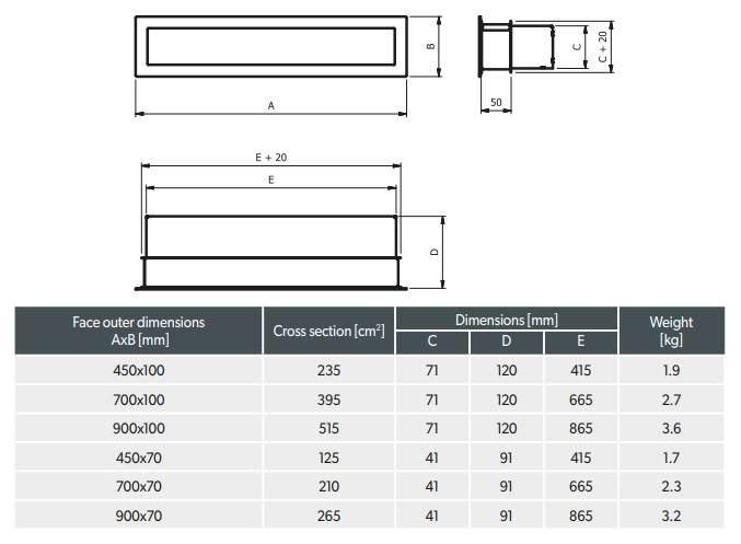 Minimál kandalló rács szálcsiszolt inox/rozsdamentes acélból.Szabad keresztmetszet: 265 cm ²Maximális alkalmazási hőmérséklet 180 °CSpeciális színtartó porfestésBeépítőkeret: Horganyzott acéllemezEsztétikus, hőálló, színtartó és korróziómentes.Ez a megoldás a modern és minimál kandalló építéshez tökéletes.INOX, azaz rozsdamentes acél- saválló, vagy nemesacél fémötvözetet nevezzük inox-nak.Előnyös tulajdonságaik miatt – korrózióálló, saválló - a kandallóbetétek gyártásában is nélkülözhetetlen anyag.Esztétikai megjelenése, hőállósága folytán dekoratív kandalló szellőző készül belőle.Tisztítása:Korrózióra ugyan nem hajlamosak, de a szokványos szennyeződések miatt takarításuk alkalmanként szükséges.Megfelelő tisztítással elérhetjük, hogy hosszú távon szépek maradjanak.Lényeges, hogy a takarítószer ne ártson. Maró anyagot ne használjunk, viszont a szennyréteget fel tudja lazítani illetve el is távolítsa azt.Makacsabb, elszíneződött foltok eltüntetéséhez használhatunk folyékony súrolószert, puha textíliát vagy szivacsot, de csak kíméletesen, óvatos dörzsöléssel. A tisztítószerek maradékát mindig alaposan távolítsuk el, és minden esetben töröljük szárazra. Ehhez konyhai papírtörlőt vagy mikroszálas törlőt használjunk.